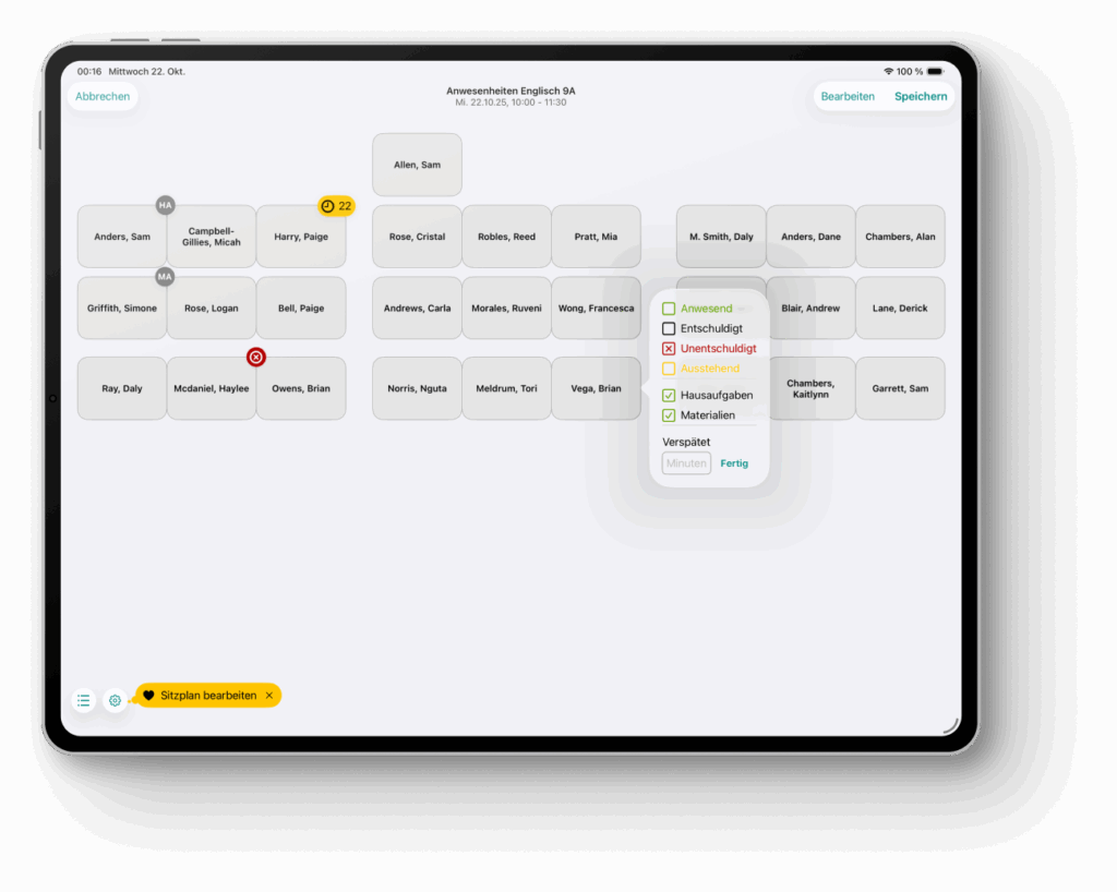 In der Kursansicht hast du all deine Unterrichtsstunden auf einen Blick. Erstelle To-dos, Checklisten, Kursberichte oder zufällige Schülerlisten für mündliche Noten oder Gruppenarbeiten.