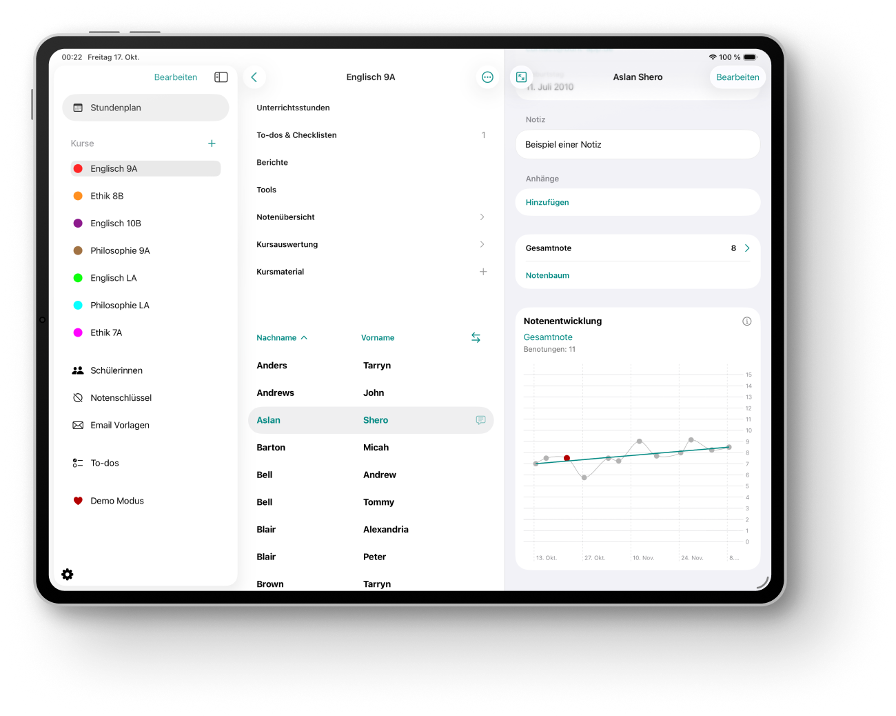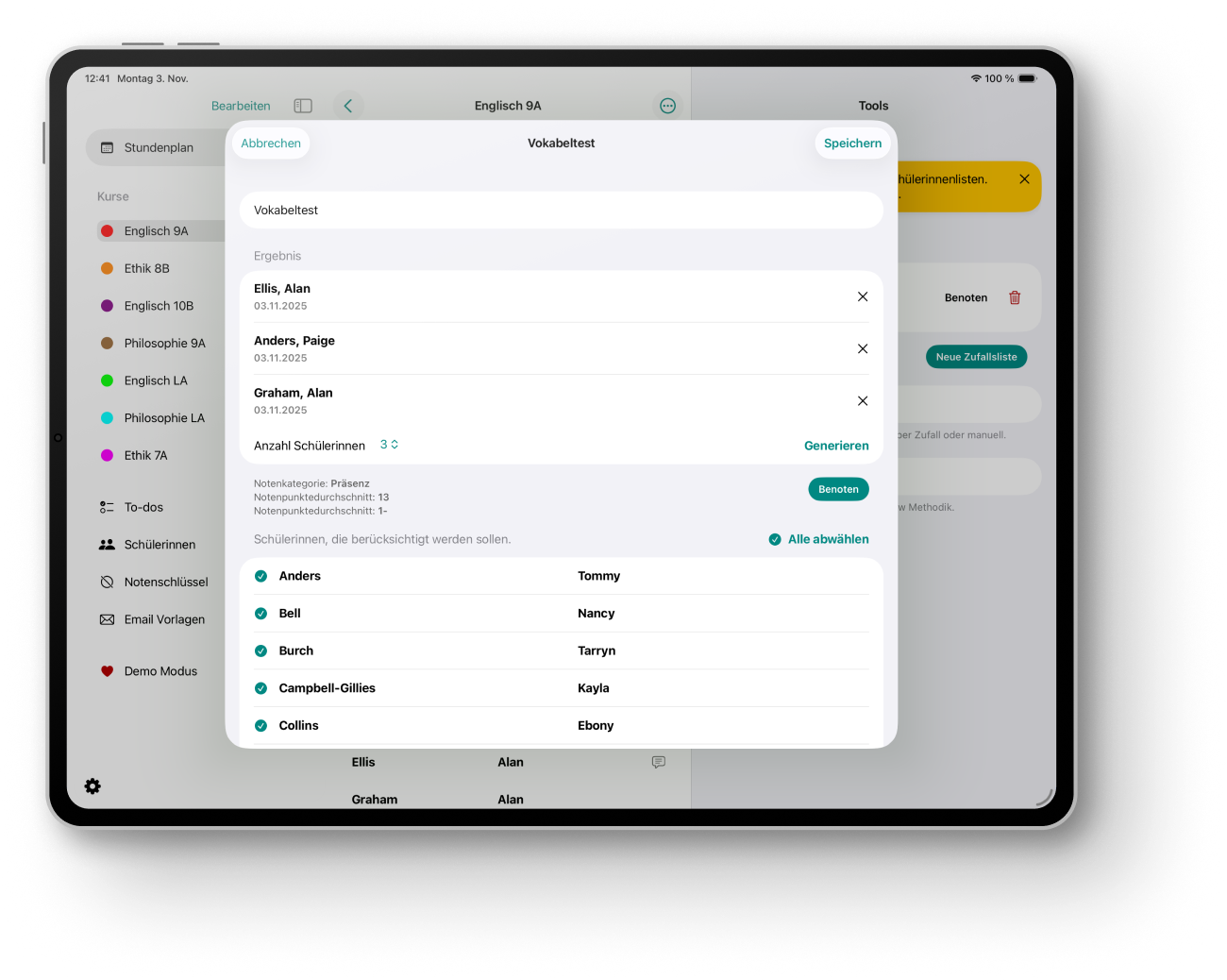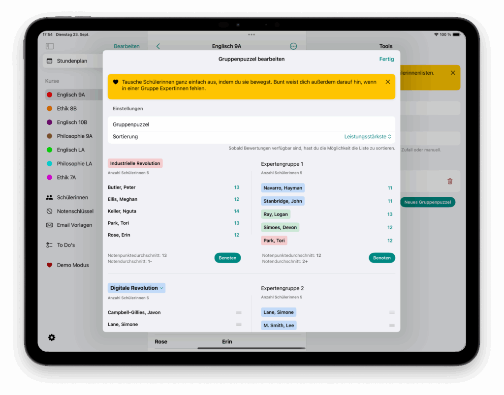 In der Kursansicht hast du all deine Unterrichtsstunden auf einen Blick. Erstelle To-dos, Checklisten, Kursberichte oder zufällige Schülerlisten für mündliche Noten oder Gruppenarbeiten.