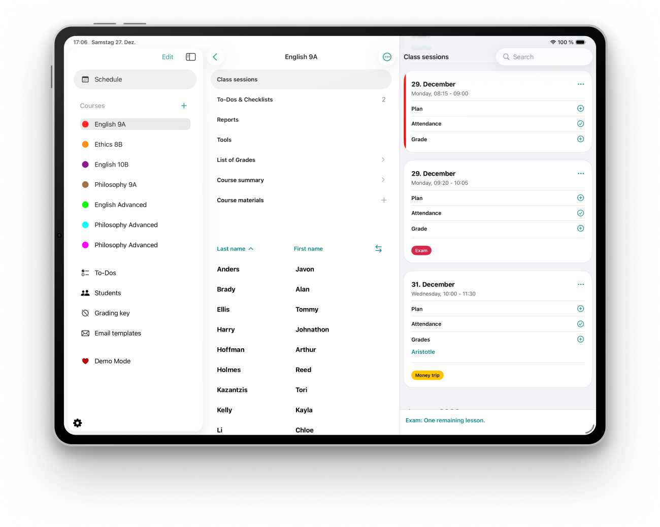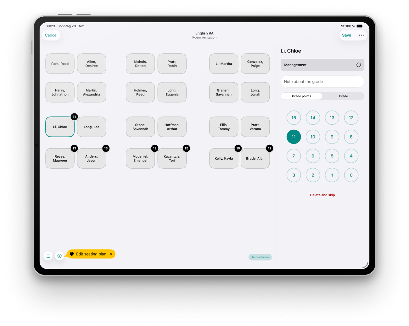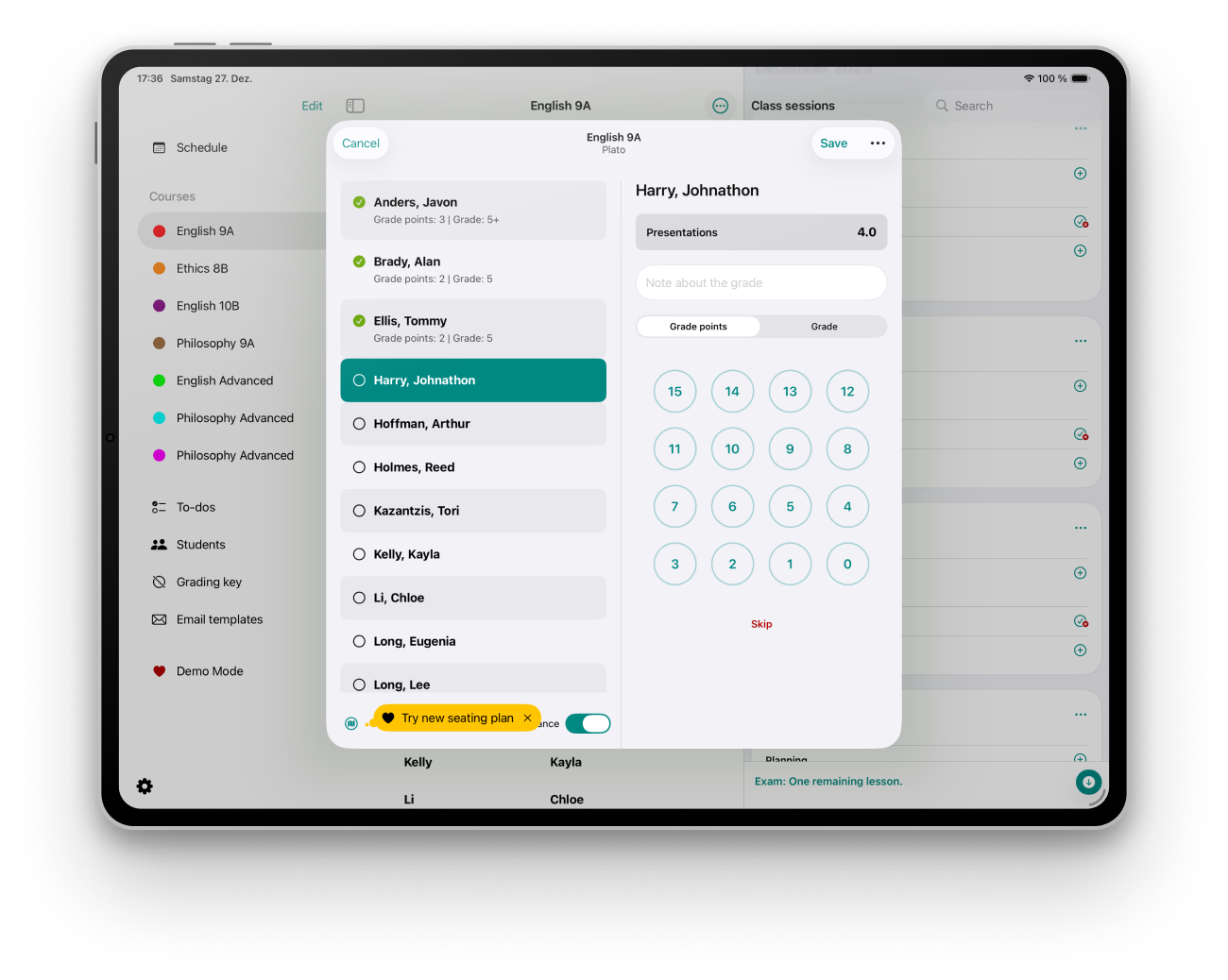 Gradebook, digital class management, timetables, seating plans, notes concerning students, and to-dos—all in one app.