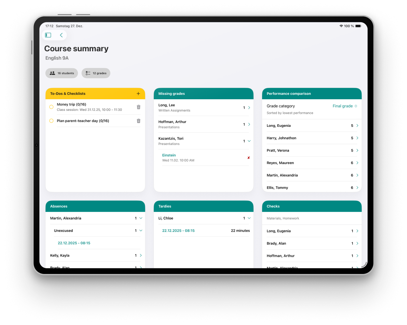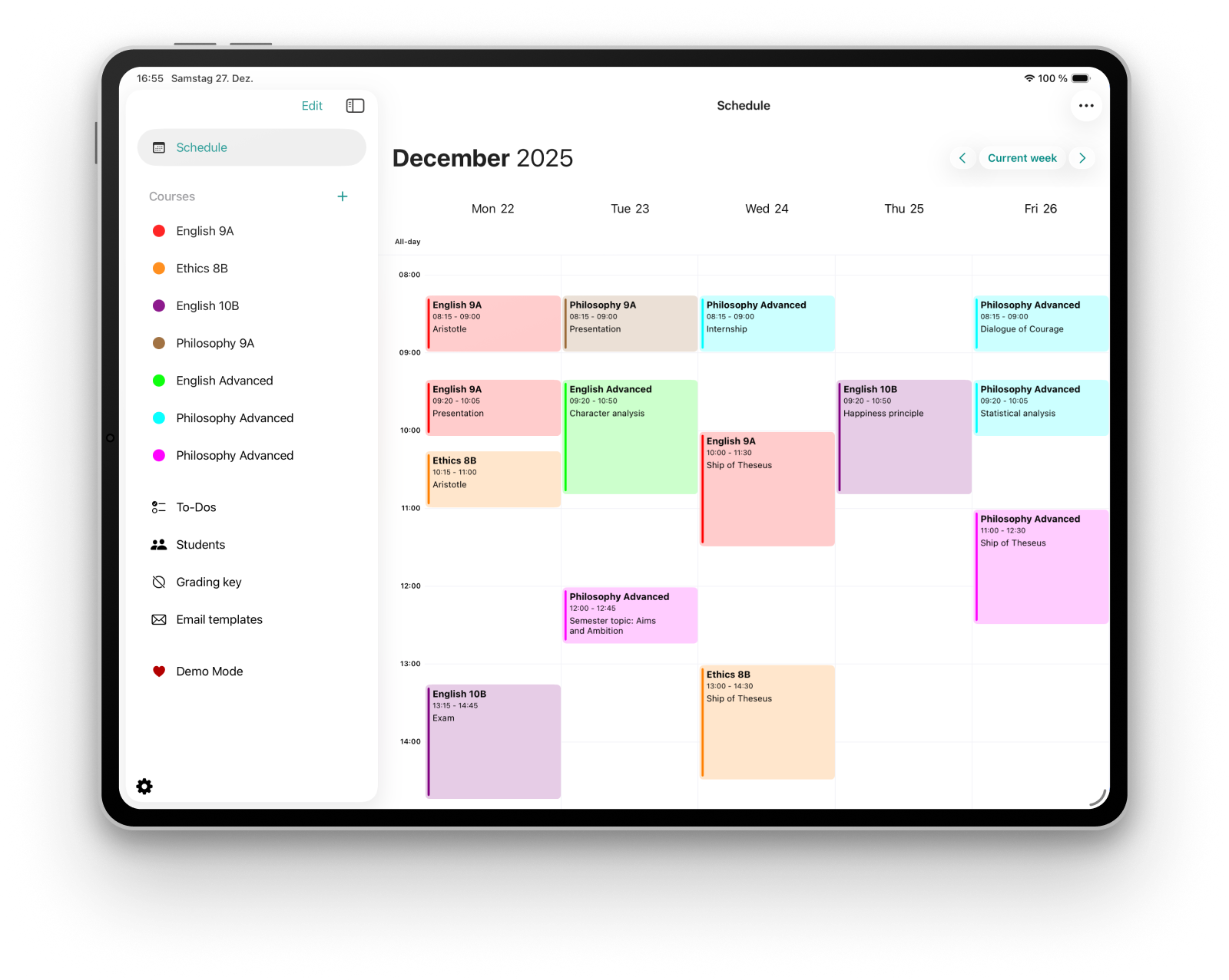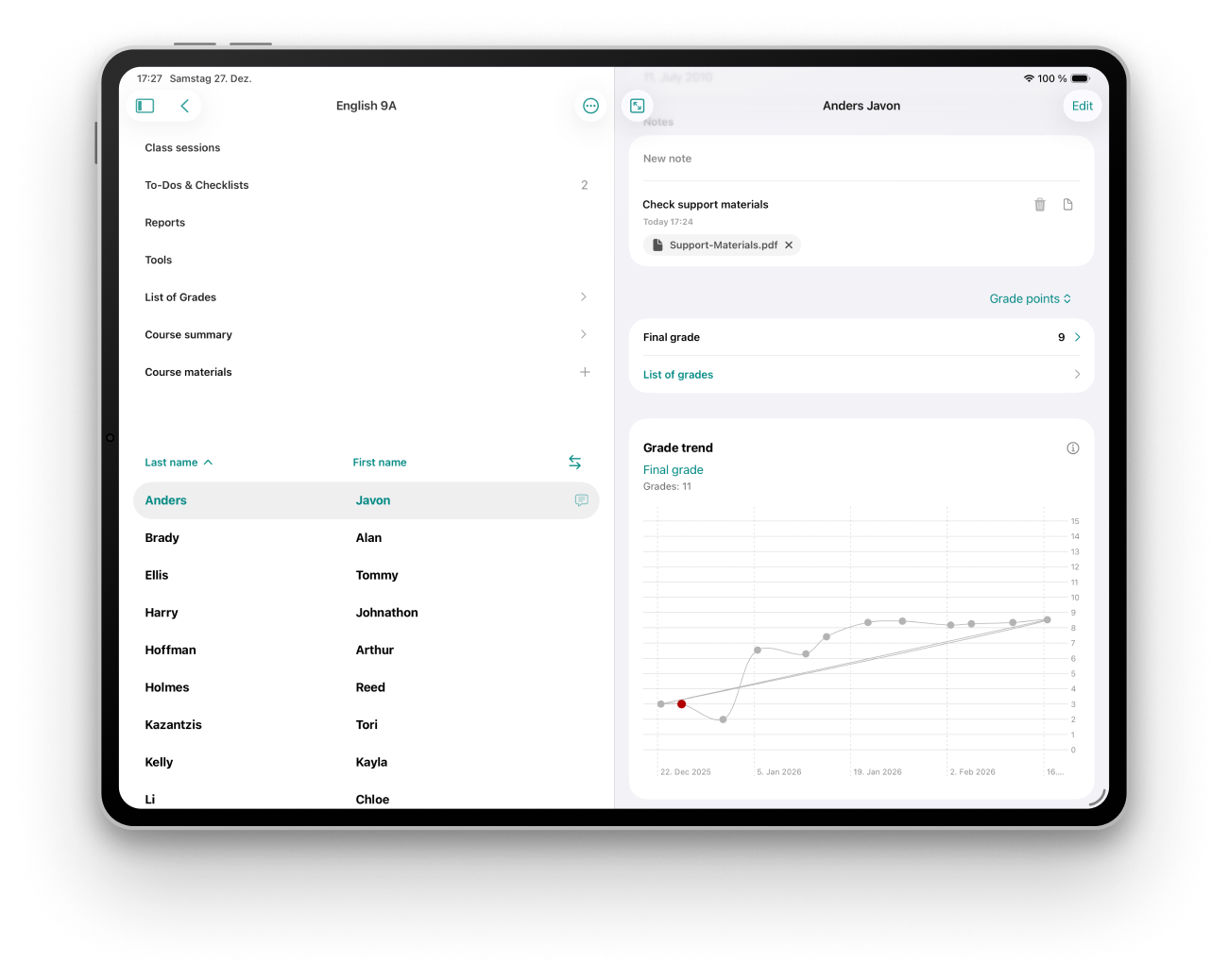 Gradebook, digital class management, timetables, seating plans, notes concerning students, and to-dos—all in one app.
