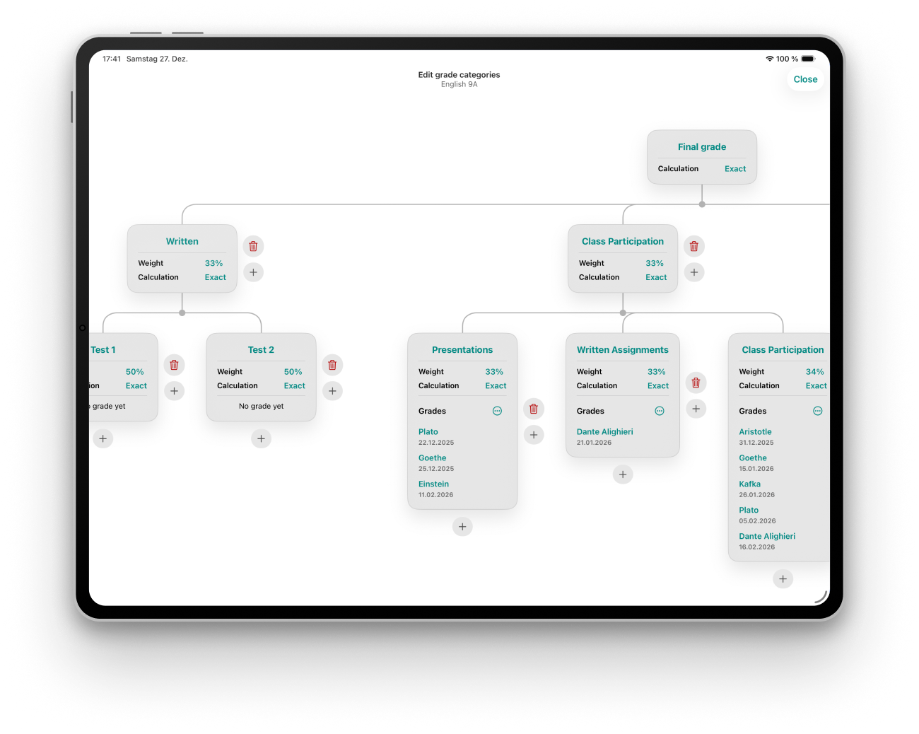 With the mind map structure, you always keep the big picture. You can access all grades within a category at any time. You can also adjust the weighting of subcategories easily — without complicated recalculations. Bunt takes care of it automatically.